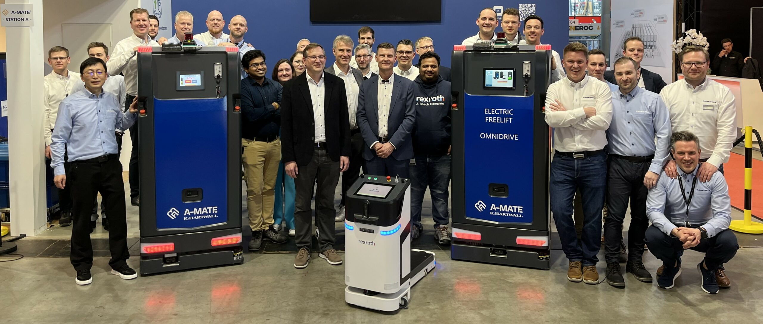 Auf der diesjährigen LogiMAT besiegelten K.Hartwall und Bosch Rexroth ihre zukünftige Zusammenarbeit am Lösungsportfolio für die Intralogistik mit einem Handschlag. Mit dem autonomen mobilen Roboter (AMR) ACTIVE Shuttle von Bosch Rexroth und dem Fahrerlosen Transportsystem A-MATE® FreeLift von K.Hartwall zeigen beide Unternehmen eine ganzheitliche, standardisierte und innerbetriebliche Transportlösung. Mit dem ACTIVE Shuttle Management System (AMS) wird Bosch Rexroth einen VDA 5050 kompatiblen Flottenmanager für beide mobile Roboter bieten.