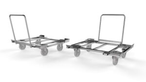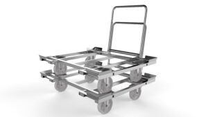 Der Daughter Cart in ISO-Größe ist ein hochbelastbarer Palettenwagen für Paletten in ISO-Größe und faltbare Container, der einen reibungslosen und kosteneffizienten Warentransport in Industrie- und Logistikumgebungen ermöglicht. Er eignet sich sowohl für den manuellen Einsatz als auch für die Integration von Routenzügen über den LiftLiner und gewährleistet einen nahtlosen Transport vom Lager zur Produktion. Der Wagen verfügt über Eckstützen für die Stabilität der Ladung und Stapeltassen für eine effiziente Lagerung bei Nichtgebrauch.