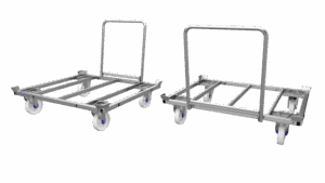 The Daughter Cart is a heavy-duty, wheeled pallet dolly designed for smooth and ergonomic transport of standard 48×40″ GMA pallets and foldable containers. Built for use in warehouse and production environments, it supports both manual movement and integration with the LiftLiner® tugger train system to enable forklift-free, efficient internal logistics.